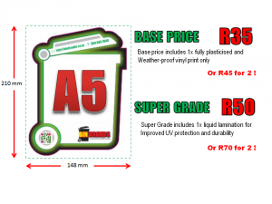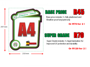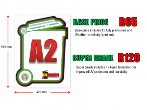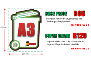 We offer ” BASE ” pricing for vinyl only prints, as well as ” SUPER GRADE ” which includes additional liquid lamination for improved UV protection and durability.